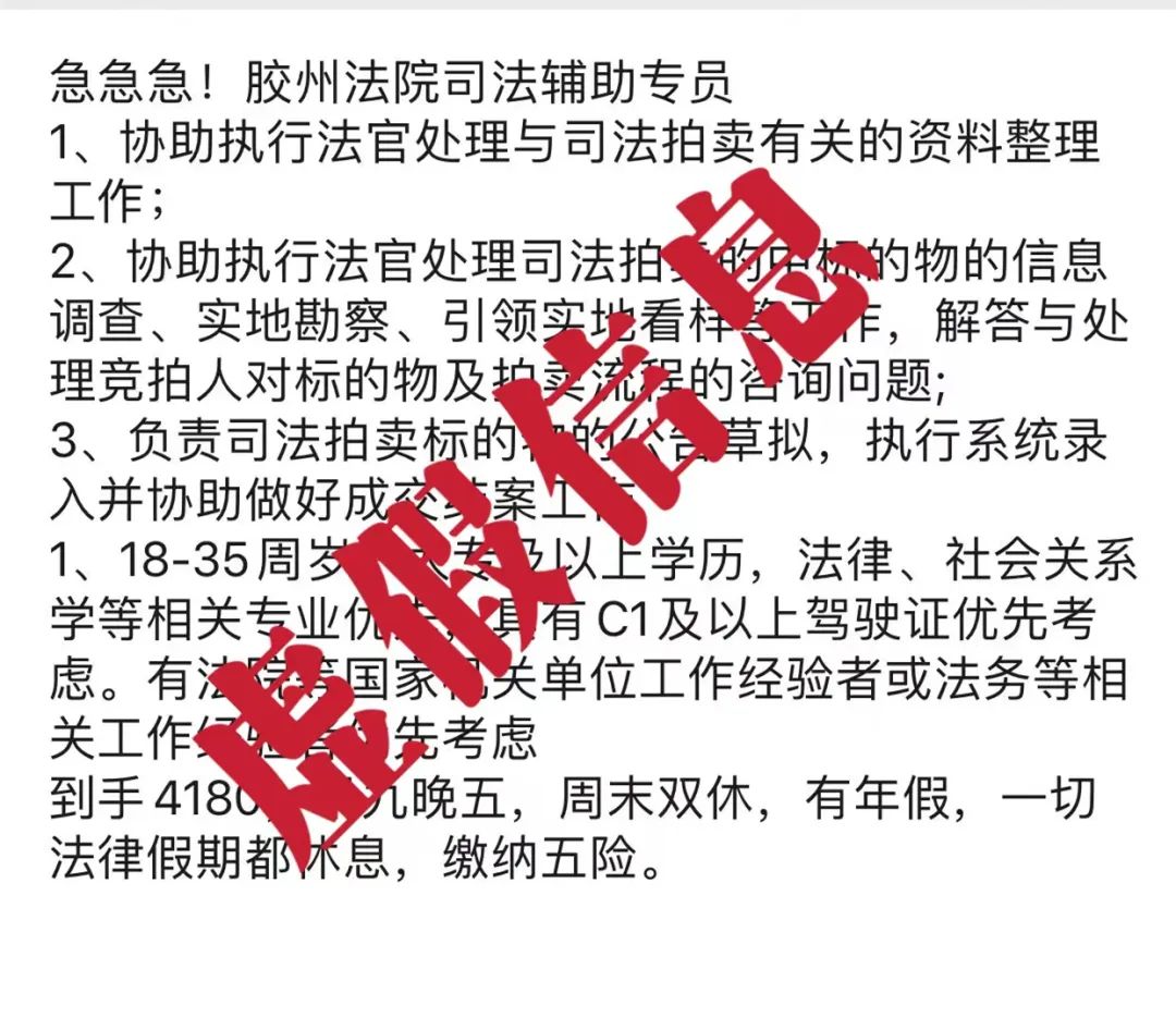 8月23日,膠州法院發(fā)現(xiàn)不法分子在微信朋友圈發(fā)布關(guān)于“膠州法院招聘司法輔助專員”的虛假招聘信息,并向求職者索要數(shù)萬元的高額手續(xù)費。該信息并非膠州法院發(fā)布,已第一時間向公安機關(guān)報案。