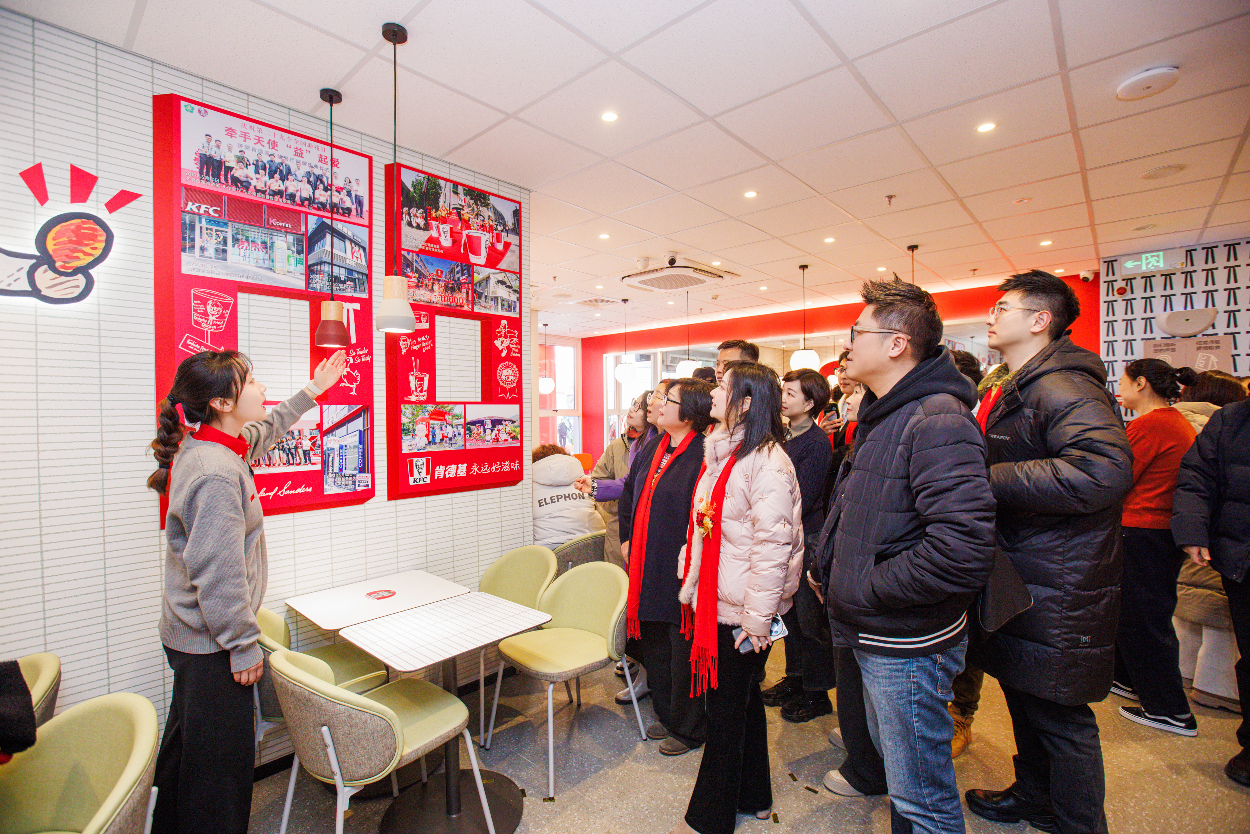 這家餐廳以紅色、白色為主色調(diào),搭配簡(jiǎn)潔的桌椅和明亮的燈光,營(yíng)造出舒適、溫馨的用餐氛圍。餐廳里內(nèi)精心布置的“肯德基山東市600+食光影像故事”墻,記錄了肯德基山東市場(chǎng)的發(fā)展歷程,以及多年來(lái)肯德基在熱心公益、承擔(dān)社會(huì)責(zé)任等方面的積極作為。用鏡頭定格雙向奔赴的精彩瞬間,把許多消費(fèi)者的記憶拉回到了從前。在歲月的流光碎影之間,永遠(yuǎn)留存著那個(gè)啃著雞腿的下午?!斑@個(gè)影像展勾起了我小時(shí)候在肯德基過(guò)生日的回憶,當(dāng)時(shí)我最期待的就是邀請(qǐng)好朋友們一起來(lái)吃全家桶,那是特別溫馨快樂(lè)的時(shí)光?!?5后于先生在拍照留念之余,不禁細(xì)數(shù)童年的難忘記憶。