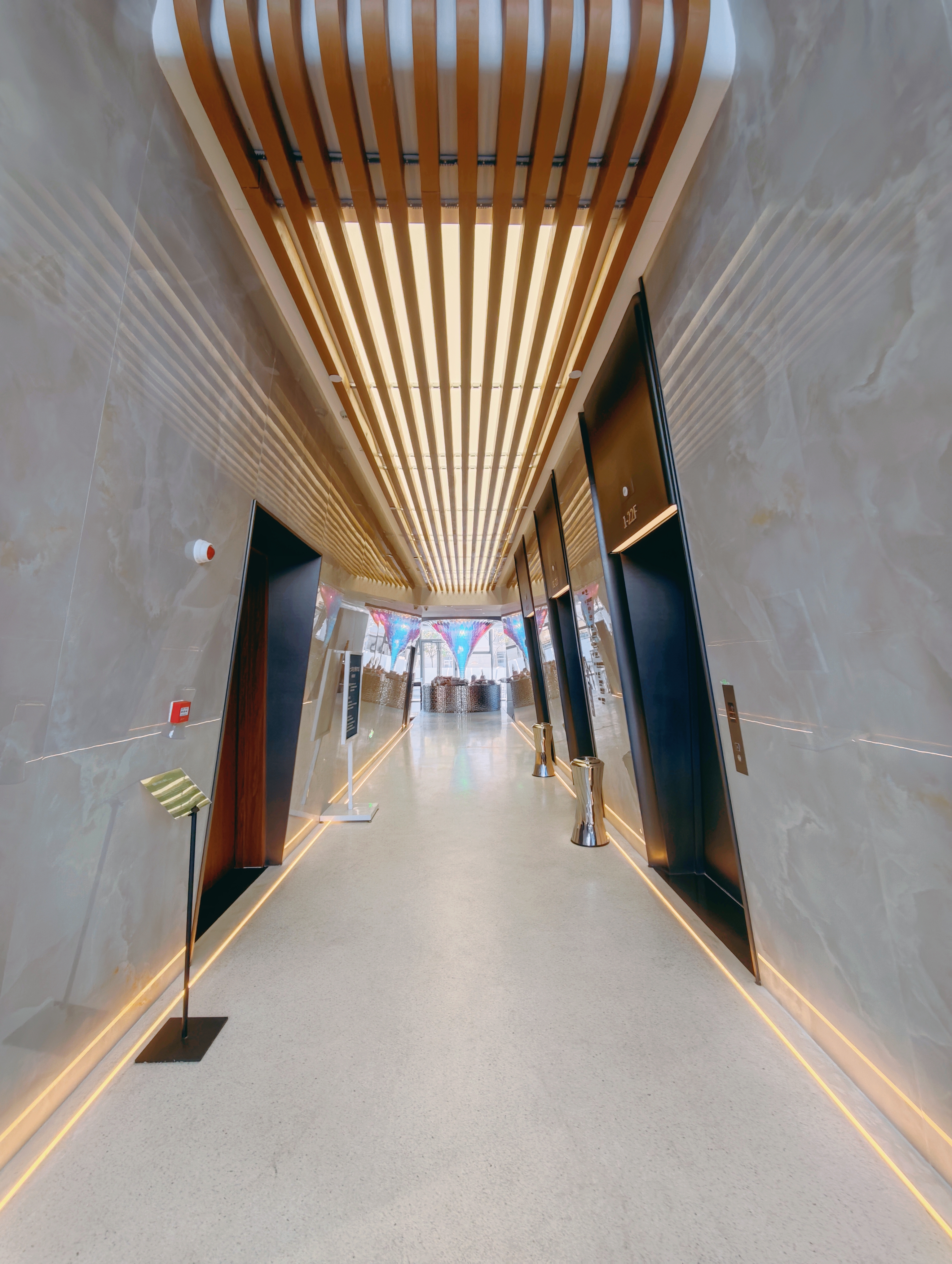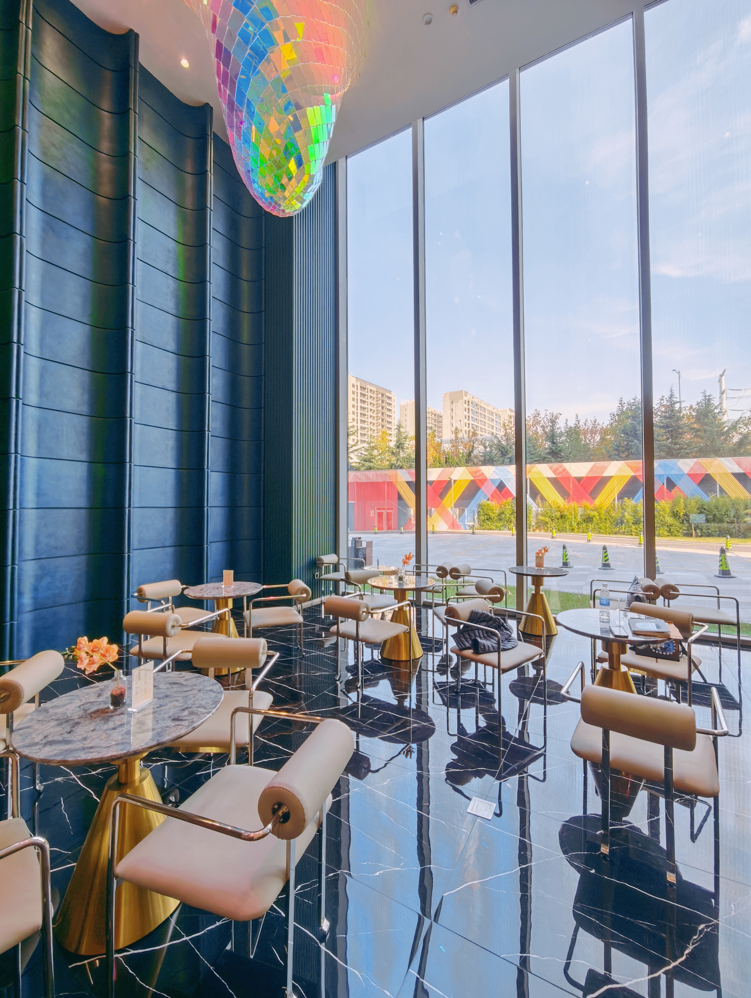 咖啡廳以“溫暖明亮”為設(shè)計基調(diào),  主視覺藝術(shù)裝置《見山》靈感源自嶗山十二景之一“太清水月”,以一種極具創(chuàng)意的倒影方式重構(gòu)嶗山山貌,運用當(dāng)代裝置語言,生動還原了“山映海上,虛實相融”的意境,從不同時間、不同角度去觀賞它時,會產(chǎn)生類似水波的光影變化,那靈動的光影仿佛在訴說著“水月映山”的詩意故事。