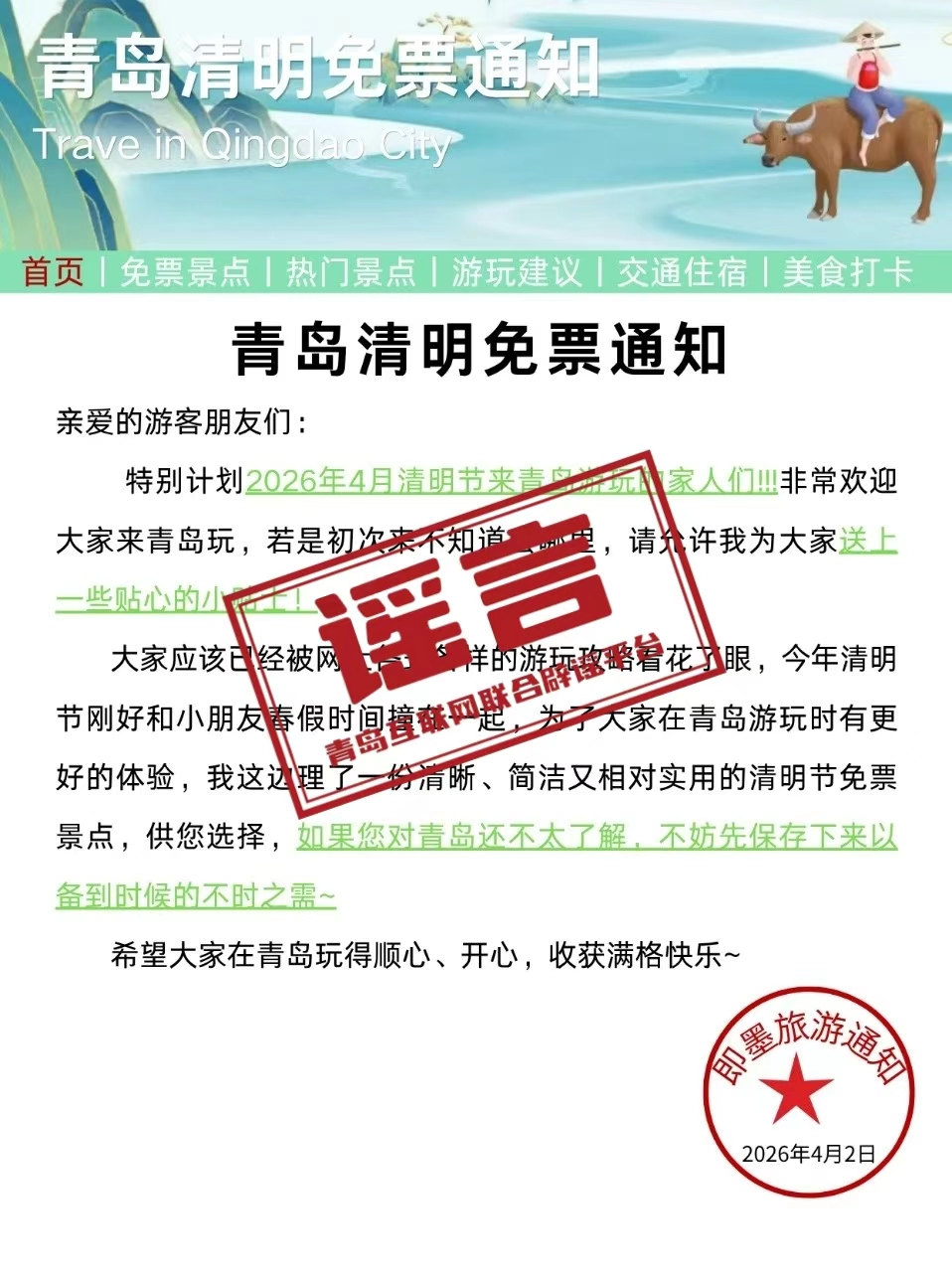 近日,隨著清明假期臨近,網(wǎng)絡(luò)上出現(xiàn)“清明旅游通知”的信息,聲稱青島等熱門旅游城市將對(duì)游客實(shí)行景區(qū)“全面免票”或大幅優(yōu)惠政策。