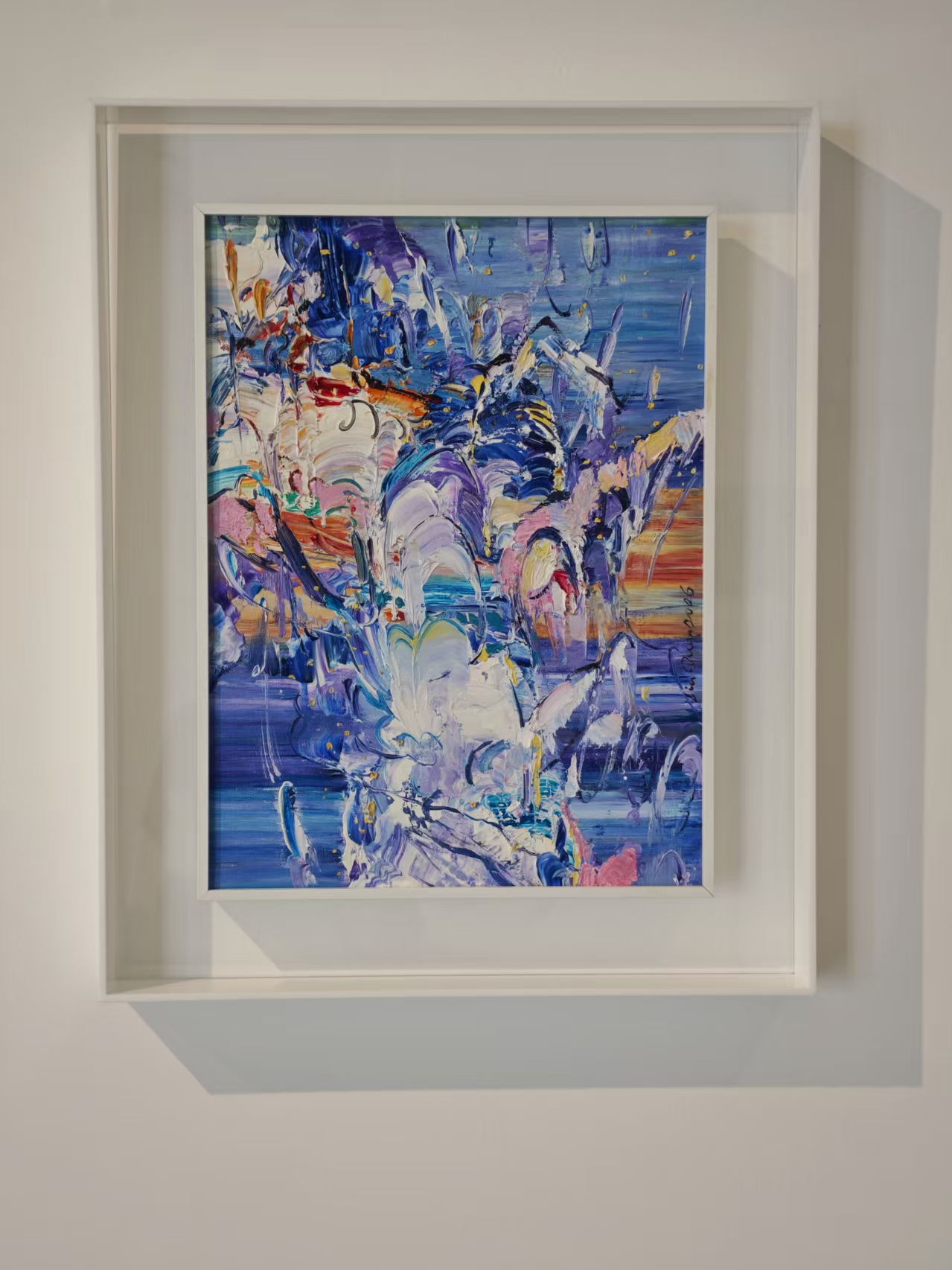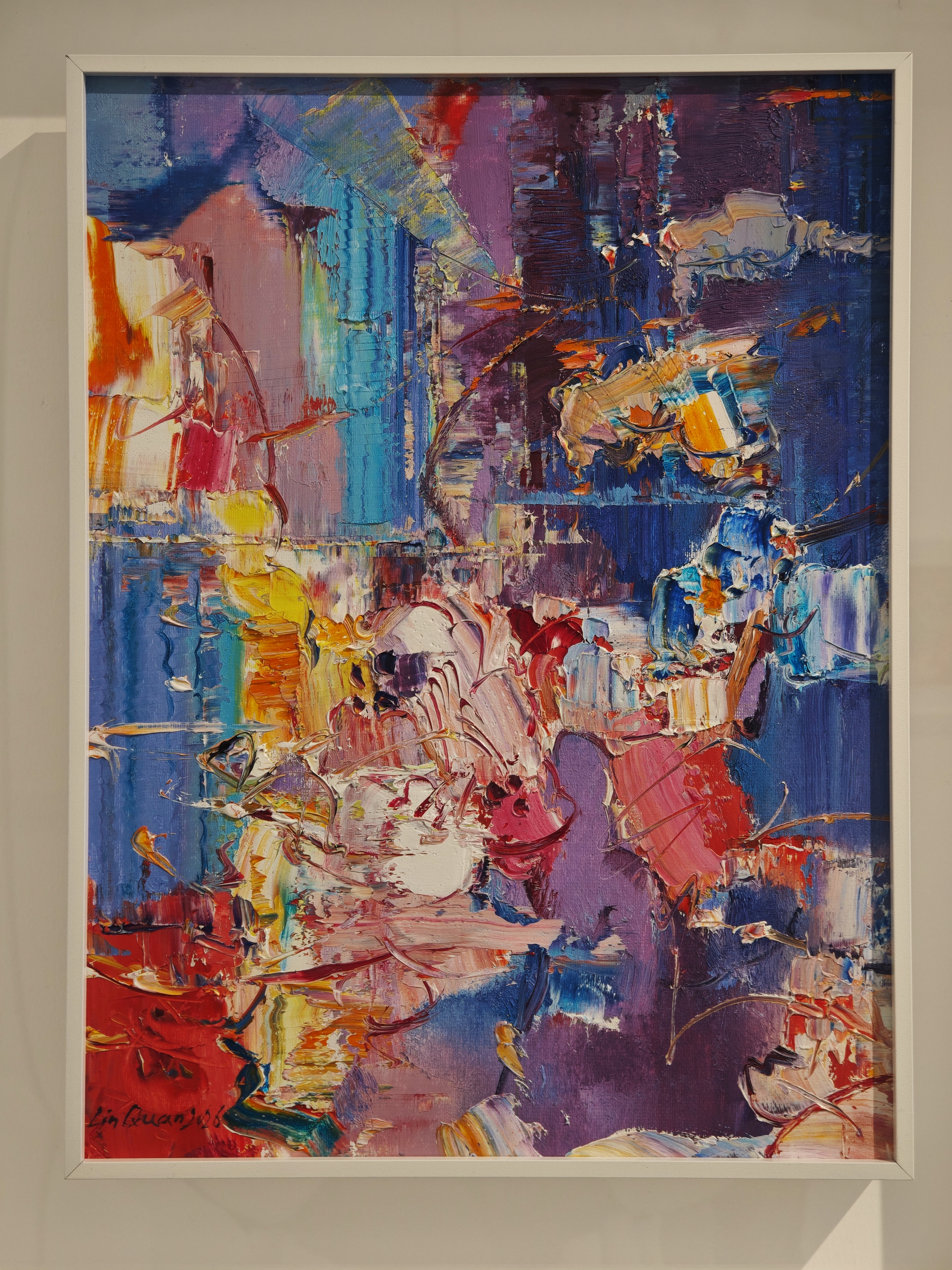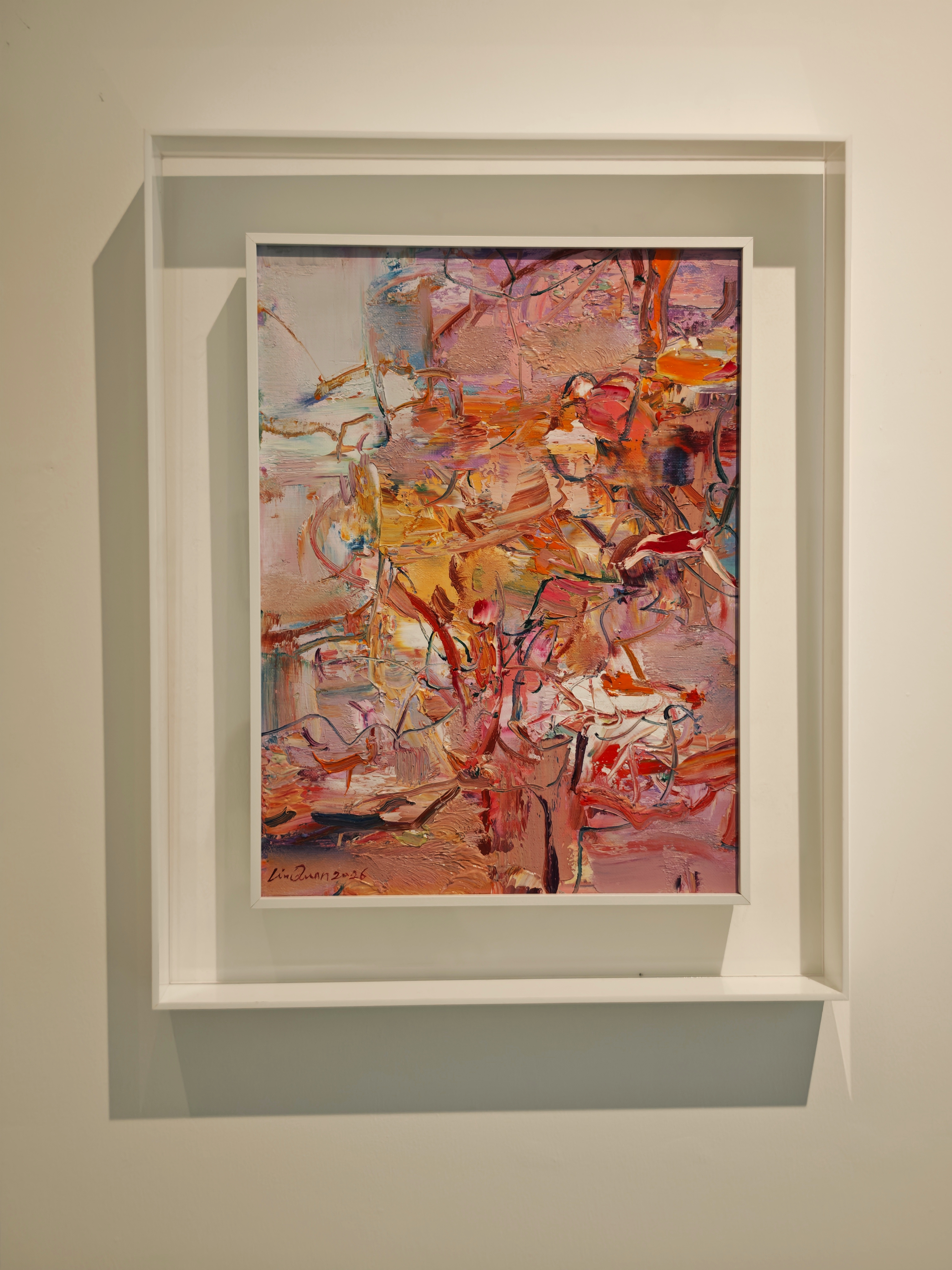 林泉的筆觸如詩,色彩如歌。飛花、荷塘、樹叢……疏枝簡葉間藏著大自然的微觀密碼。他以似與非似的抽象語言,讓物與心對(duì)望,讓觀者瞬間放下負(fù)擔(dān),仿佛置身無限時(shí)空的交匯點(diǎn)。