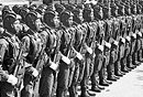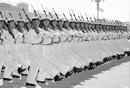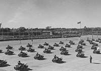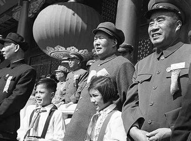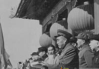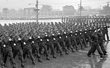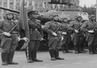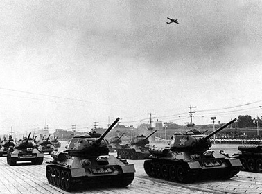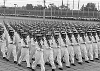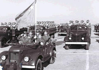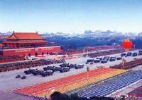 1959年國慶10周年閱兵式,毛澤東陪同蘇聯(lián)領(lǐng)導(dǎo)人赫魯曉夫和蘇斯洛夫以及來自十多個(gè)社會(huì)主義國家和六十多個(gè)國外共產(chǎn)黨的領(lǐng)導(dǎo)人登上了天安門城樓 。1959年的閱兵規(guī)模比以往大,準(zhǔn)備工作也比較早。當(dāng)時(shí),天安門廣場(chǎng)已擴(kuò)建一新。整個(gè)廣場(chǎng)較五周年國慶時(shí)擴(kuò)大了兩倍半,達(dá)40萬平方米。 |
