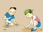 彈珠界多是男孩的天下。在地上摁1至5個(gè)小洞,然后從起點(diǎn)將玻璃球滾向指定洞內(nèi),以最先完成規(guī)定洞數(shù)者贏。彈球的材質(zhì)各不同,最高檔的是玻璃的,中間有彩色圖案,低檔的是鐵的,最低檔的是泥巴搓的。高手能手拿玻璃球幾米之外擊中地下的另一只玻璃球,甚至可以十米外一球進(jìn)洞。