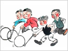記得在上學(xué)、放學(xué)的路上,邊走邊滾鐵環(huán),不但能夠免去行路的單調(diào),而且加快了行走的速度,樂趣無窮。技術(shù)好的單手拿鐵鉤將鐵環(huán)往前一送,鐵環(huán)就乖乖轉(zhuǎn)動(dòng)起來。滾在路上也能“停車”,即鐵環(huán)斜靠在“車把”上,要滾時(shí)彎鉤輕輕起動(dòng)就行。除了直走,還能帶著鐵環(huán)拐彎,穿越障礙。