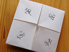 一張正方形的薄紙,只需簡單的幾步便能折出一個(gè)東南西北。有四個(gè)小正方形的一面是外面,四個(gè)角寫上東南西北四個(gè)方向。有8個(gè)小三角形的一面是里面,寫上八種不同稱謂。小時(shí)候?qū)懙亩际请娨晞?dòng)畫片中的角色,如孫悟空、葫蘆娃、妖妮大姐等。一般好人壞人美角丑角各占一半。自己也玩的不亦樂乎。